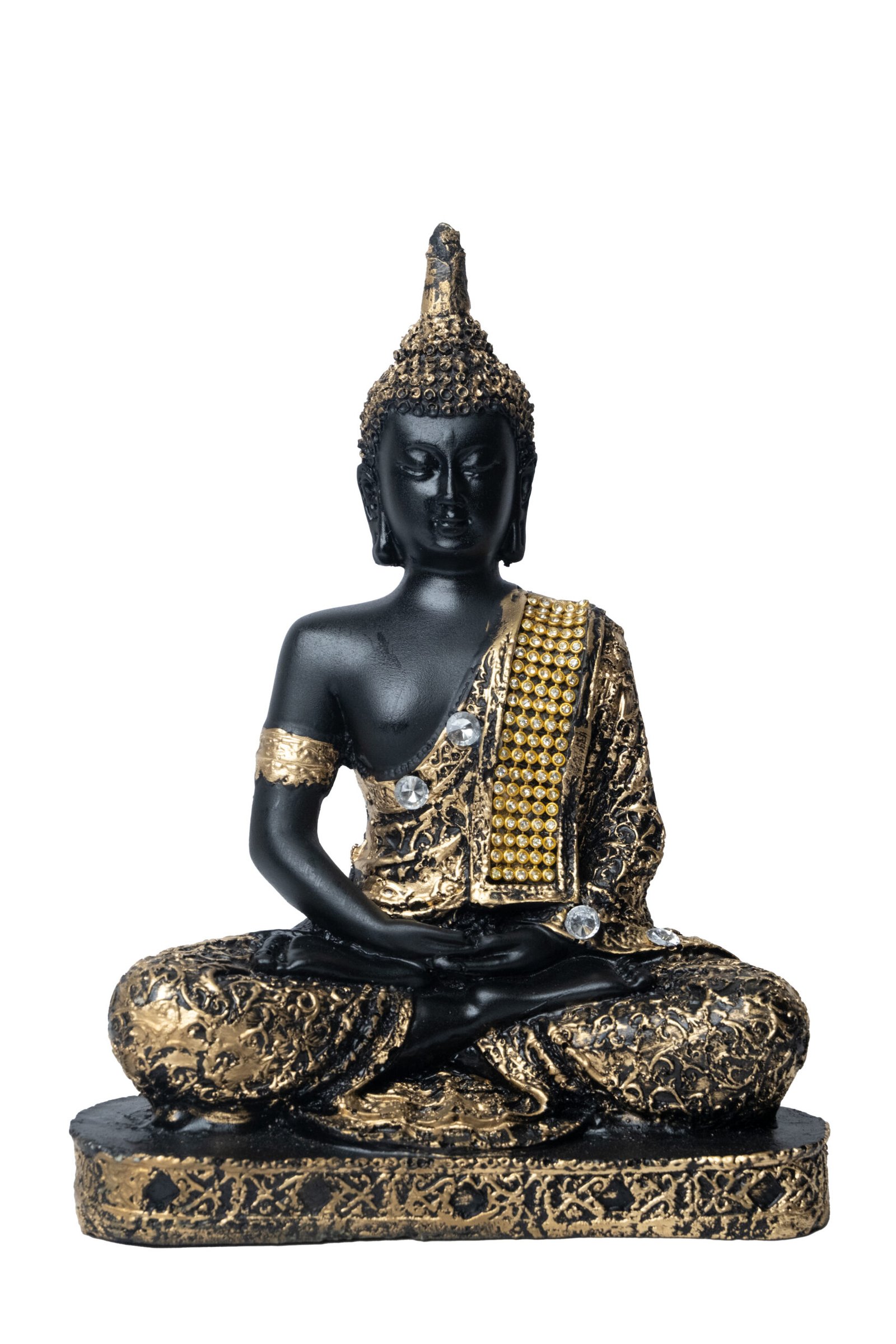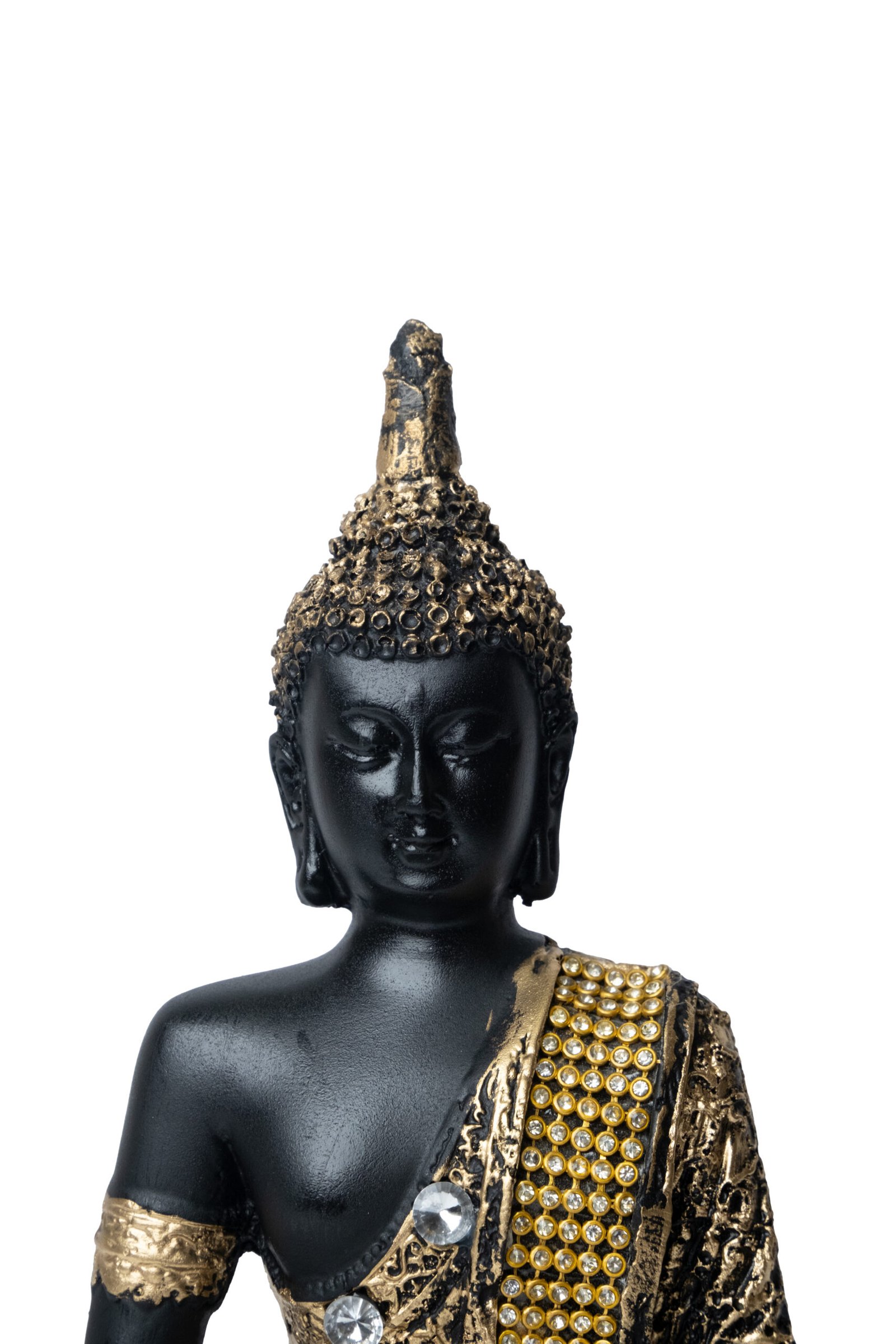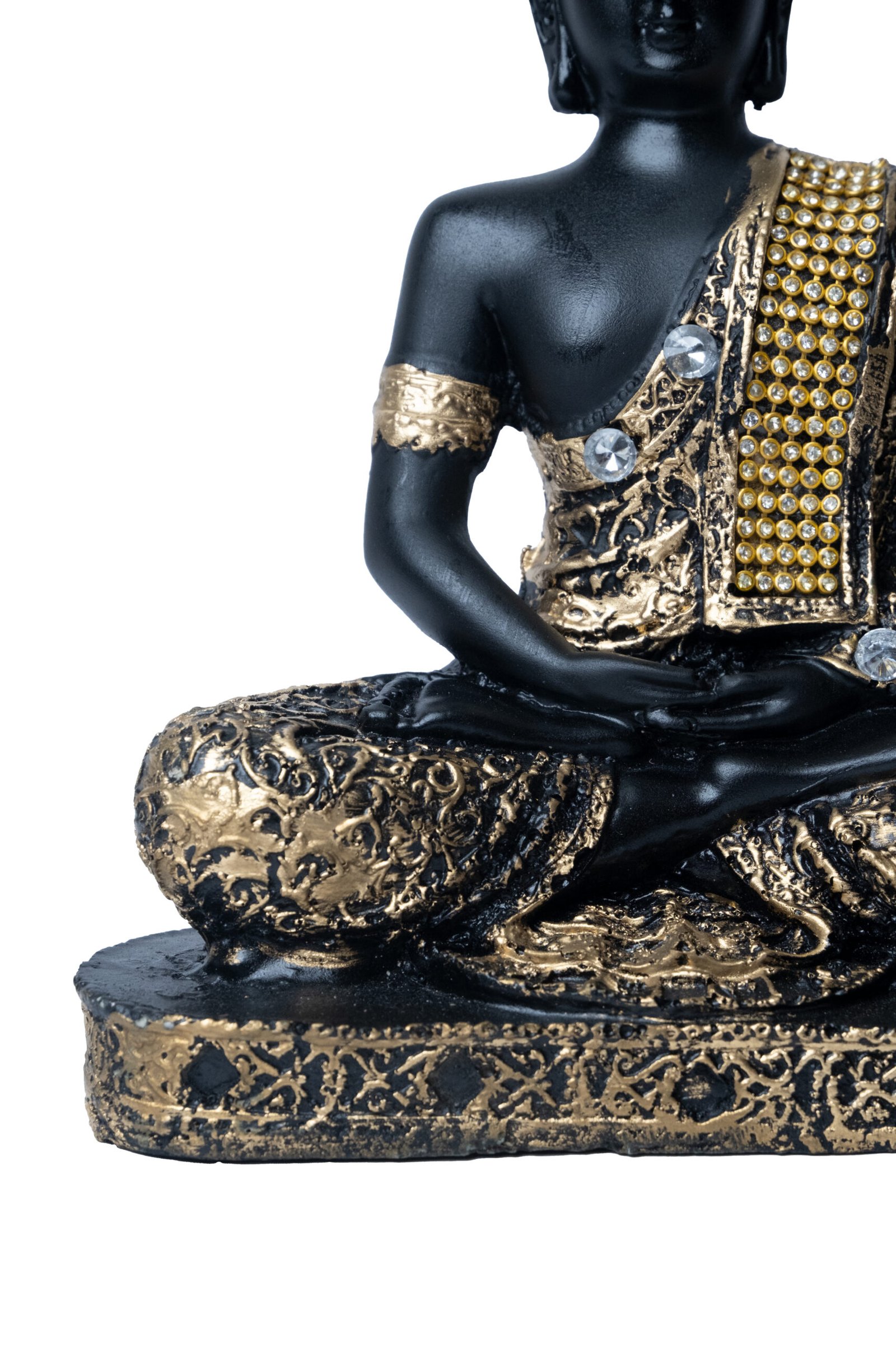 Elevate your spiritual space with this magnificent Black and Gold Meditating Buddha Statue, a masterpiece that combines serenity with opulent design. This striking decorative piece features a Buddha figure seated in the classic lotus meditation posture (Dhyana Mudra), symbolizing inner peace, enlightenment, and spiritual awakening. The dramatic black matte finish contrasted with elaborate gold detailing creates a visually stunning focal point for any room.