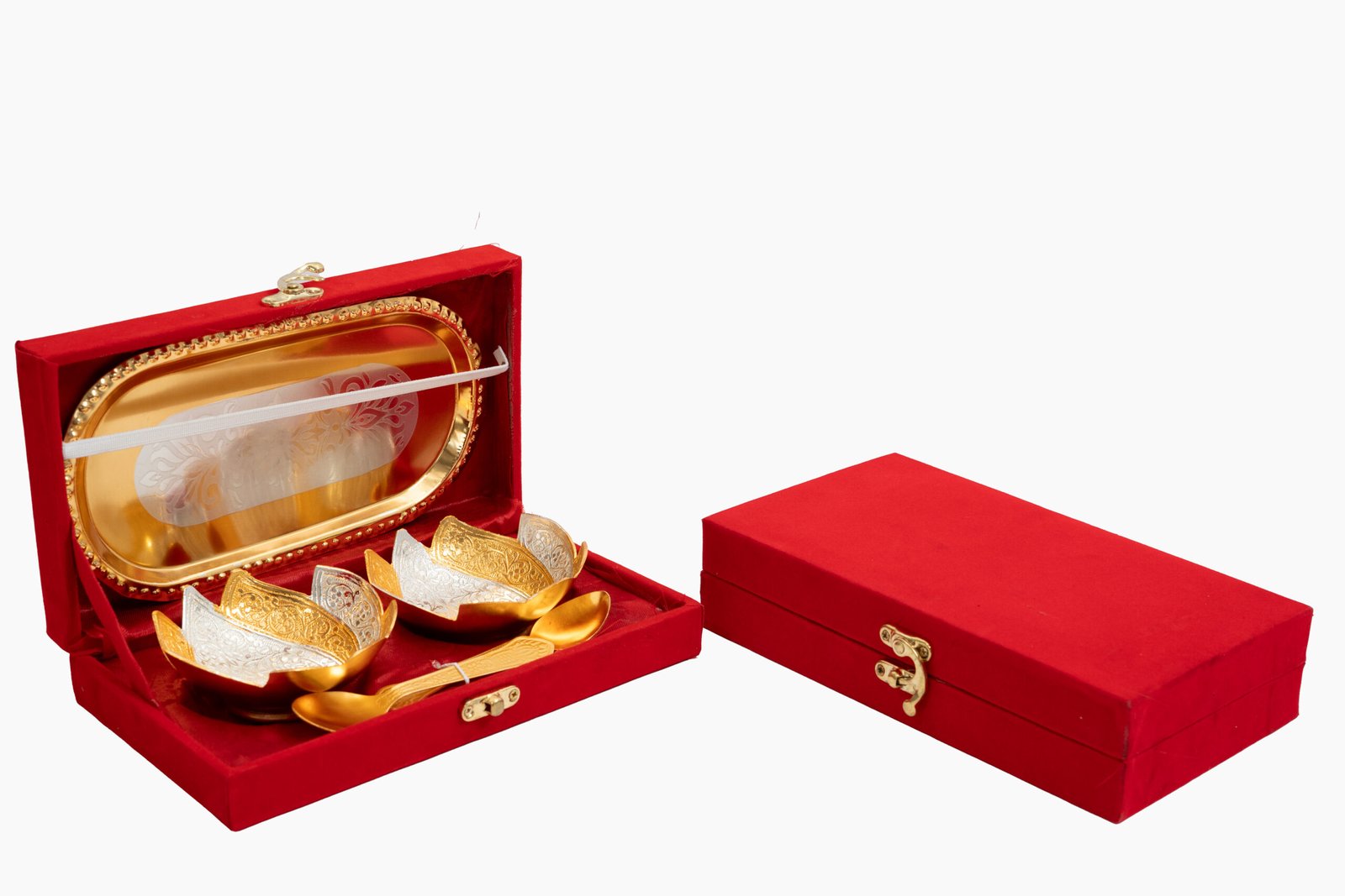 The craftsmanship of this brass bowl set with tray and spoons showcases superior attention to detail. The matching decorative tray features ornate embossed borders and provides an elegant presentation platform for the bowls. Two matching brass spoons with detailed handle designs complete the set, ensuring functionality alongside beauty. Everything is housed in a luxurious red velvet-lined gift box with gold clasps, making presentation effortless and impressive.