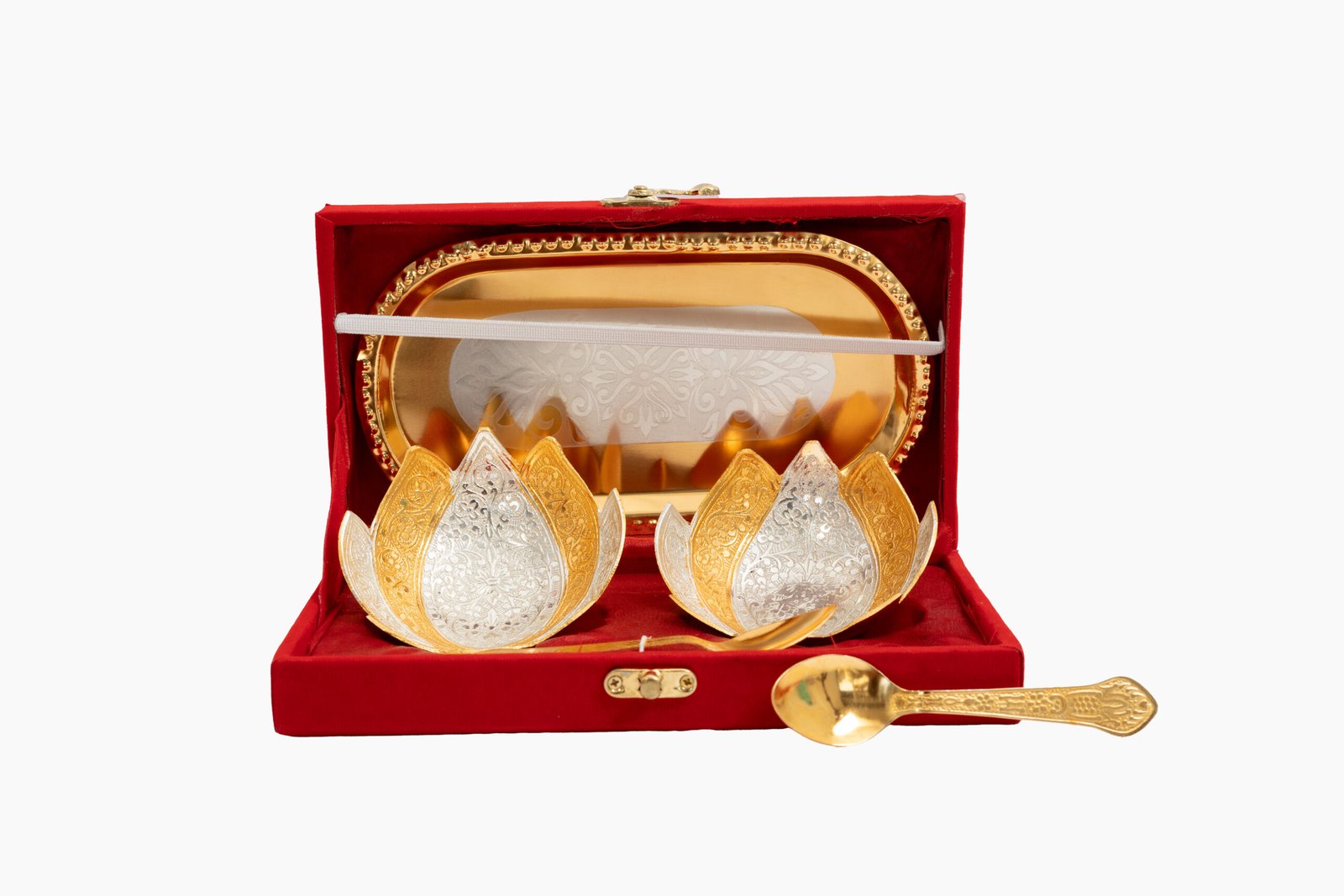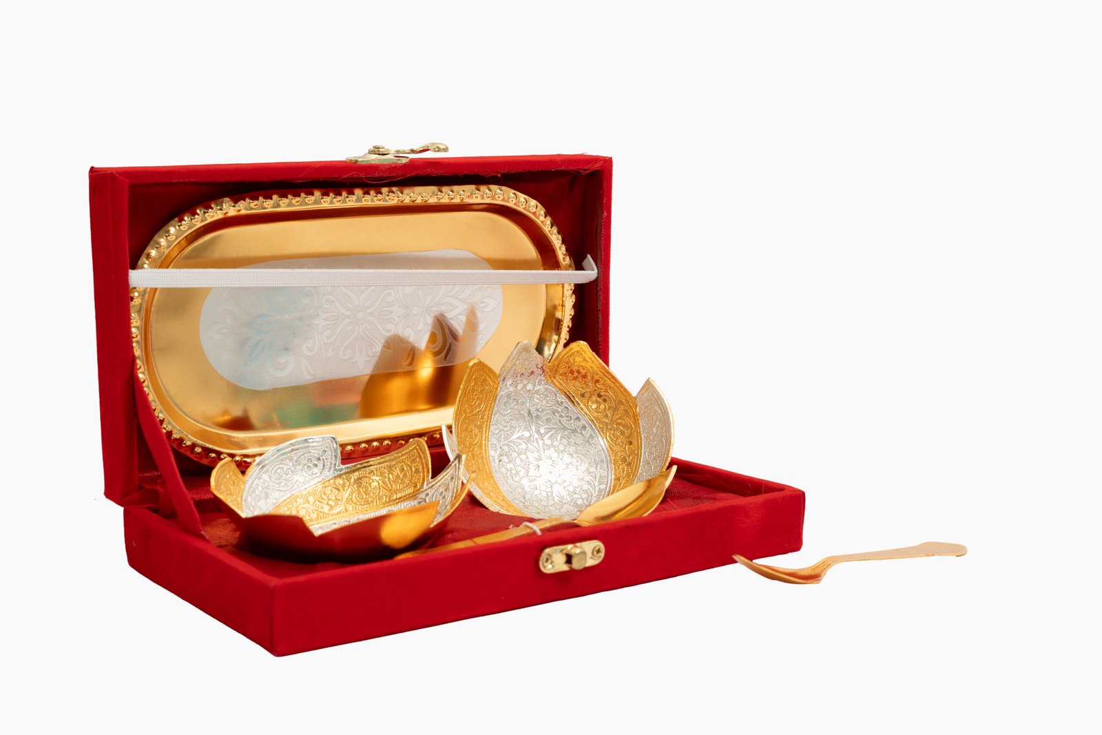 This serving set is particularly popular during wedding seasons and major Indian festivals when traditional gifts are exchanged. The lotus design makes it especially appropriate for spiritual and auspicious occasions, while the luxurious presentation ensures it’s suitable for high-value corporate gifting.