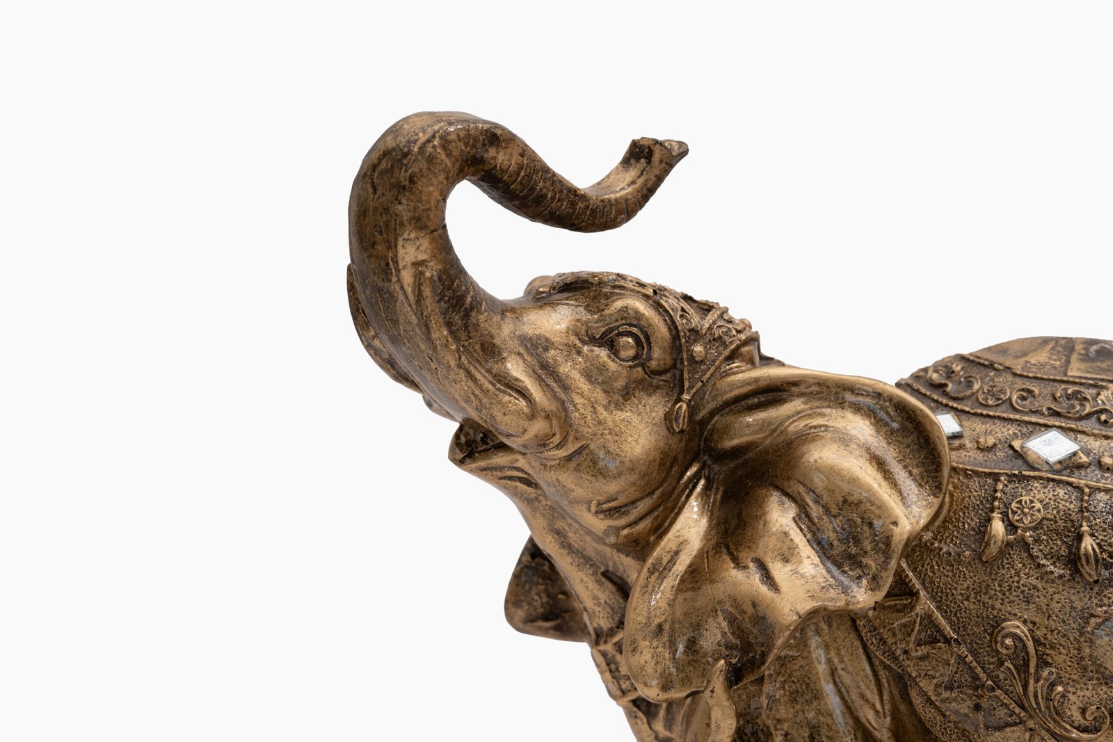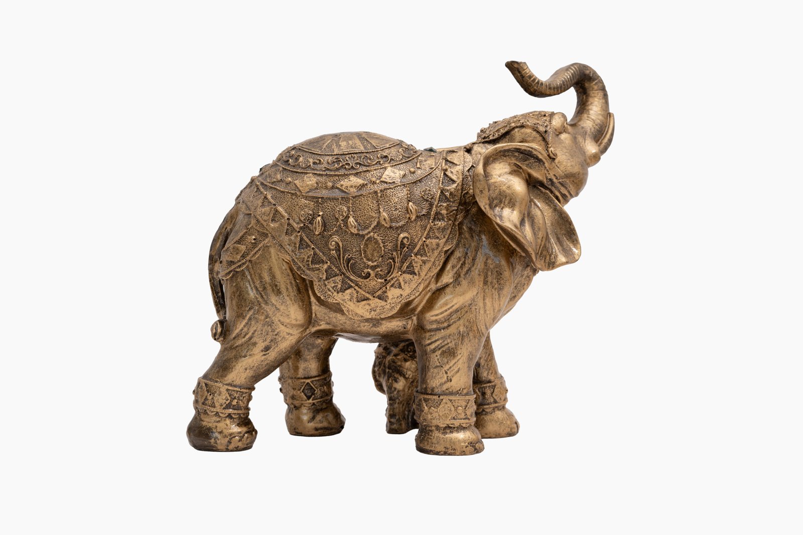 Exquisite Craftsmanship: Every detail of this brass elephant figurine has been meticulously handcrafted by skilled artisans. The ornate saddle cloth features delicate floral patterns, geometric designs, and traditional motifs. The trunk raised upward in a victorious pose, adorned anklets, and realistic textures create a lifelike appearance. The antique gold finish adds depth and character, making it a true statement piece.