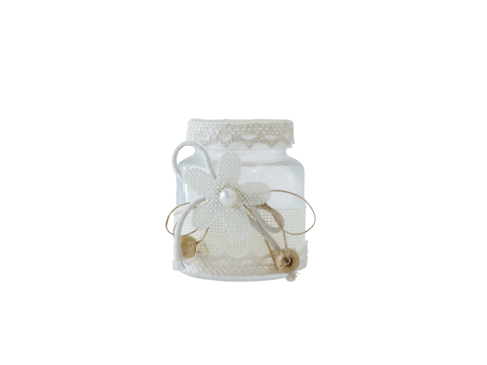 A charming burlap bow adorned with pearl bead creates focal point embellishment. The natural burlap provides rustic texture contrasting with delicate lace beautifully. Additionally, the pearl accent adds touch of elegance and sophistication throughout. The glass jar wedding favor balances rustic and refined elements harmoniously.