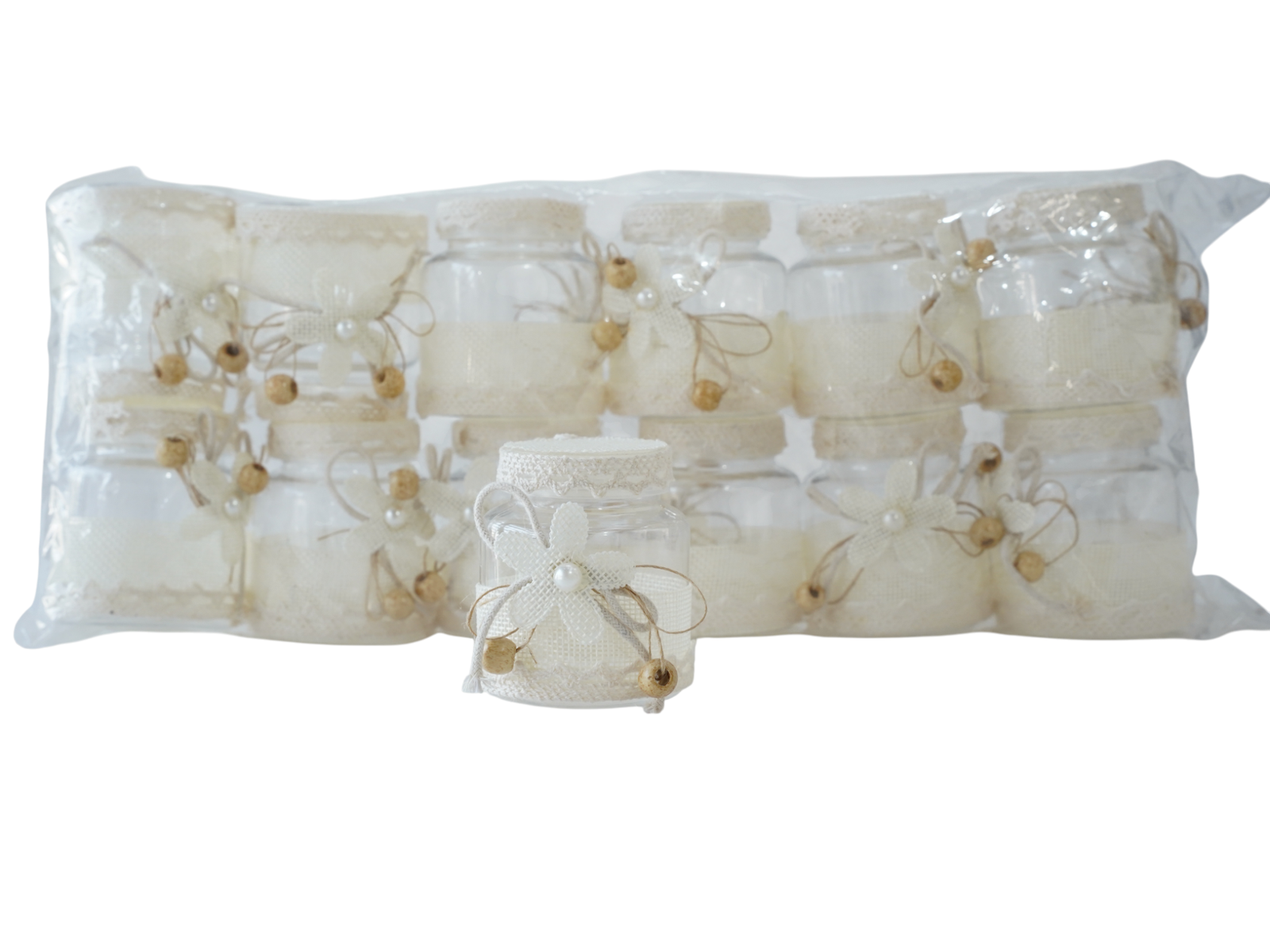 Create unforgettable wedding memories with our beautiful Decorative Glass Jar Wedding Favor featuring delicate lace, pearl accents, and rustic charm. This exquisitely embellished jar combines timeless elegance with practical reusability for perfect gift presentations.