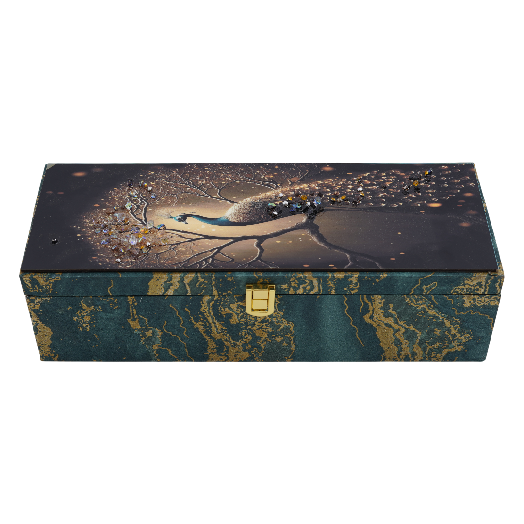The body of this peacock dry fruit box features sophisticated teal-green marble patterns. Golden veining throughout creates luxurious visual texture. Additionally, the rich color palette exudes opulence and refinement. The marbled finish appears hand-painted and artistic. Furthermore, the dark green base complements the peacock artwork perfectly. Therefore, every design element harmonizes beautifully.